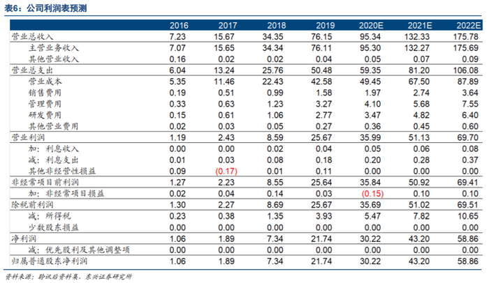 预计公司2020年-2022年实现营业收入分别为95.34亿元、132.33亿元、175.78亿元;净利润分别为30.22亿元、43.20亿元和58.86亿元;EPS分别为0.52元、0.74元和1.01元,对应PE分别为70X、49X和36X。首次覆盖给予“推荐”评级。