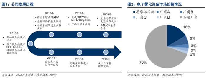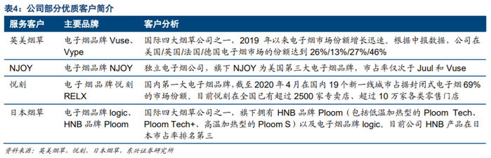 凭借技术与制造优势,公司不断开拓优质客户。截至2019年,公司在封闭式电子烟方面的主要客户包括美国市占率排名第2和第3名的英美烟草(旗下品牌Vuse、Vype)和NJOY,以及国内市占率排名第一的悦刻。雾化组件方面的主要客户包括日本烟草(旗下品牌Ploom)等。