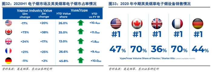 英美烟草:2020上半年电子烟/HNB销售收入增长39%/-12%,其中在美国电子烟收入同比增长70%。新型烟草板块(电子烟、HNB、口嚼烟)计划于2025年达到50亿英镑,对应年均目标增速26%。目前电子烟市场份额提升顺利,电子烟设备销售量排名多国第一,未来强劲增长可期。