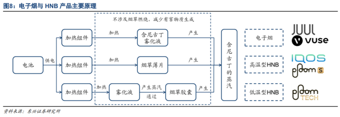 电子烟的原理,是通过电池为雾化器供电,将其中含有尼古丁的烟液雾化后供人吸入;根据烟液是否可反复注入雾化器,电子烟分为开放式和封闭式两种。HNB则是以电池驱动加热系统,通过加热烟草产生含有尼古丁的雾气。其中高温型HNB由加热元件直接接触并加热烟草,从而产生雾气;低温型HNB由雾化器产生蒸汽,蒸汽进一步通过烟草胶囊产生含尼古丁的雾气。由于不涉及烟草的直接燃烧,两种新型烟草在提供尼古丁的同时,能有效减少传统卷烟产生的有害物质。
