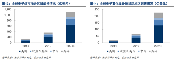 与之对应的,全球电子雾化设备销售也主要集中在三大市场。按货运地区划分,2019年美国、欧盟及英国、中国三大地区的雾化设备出厂规模分别占全球的57.1%/19.4%/6.7%。根据弗若斯特沙利文的预测,未来5年三大地区的出厂规模将以27.9%/26.0%/28.8%的年均增速扩张,至2024年分别达到131亿/41亿/16亿美元,分别占全球的57.6%/18.2%/7.0%。