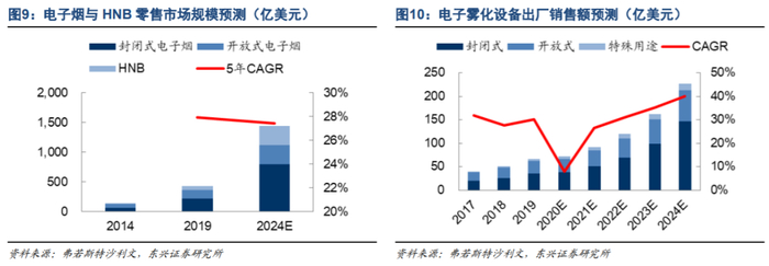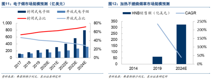 封闭式电子烟和HNB渐成主流。封闭式电子烟和HNB产品相比开放式电子烟更加便携、易使用,普及速度略胜一筹。根据弗若斯特沙利文的预测,封闭式/开放式电子烟/HNB未来5年的市场规模将以29.6%/16.2%/39.9%的年均增速扩张,至2024年分别达到797亿/318亿/325亿美元。