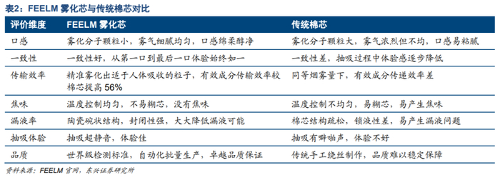 陶瓷加热技术领先全球,大幅改善电子烟使用体验。传统的电子烟使用棉芯作为雾化芯,存在雾气口感不均匀、体验随抽吸时长变差、容易糊芯等固有问题。公司研发的第二代陶瓷加热技术FEELM在雾气口感和稳定性等方面有大幅改善,明显提升了消费者体验。