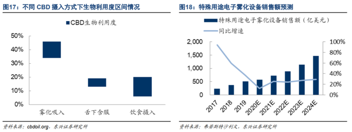 随着相关研究和应用的推进,雾化技术有望更广泛地应用于CBD消费,并拓展更多的医疗应用场景;非电子烟用途的电子雾化设备销售额也将持续增长。根据弗若斯特沙利文的预测,2024年全球特殊用途电子雾化设备出厂销售额将达到14.71亿美元,5年年均增速23.5%。