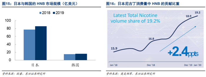 日本和韩国是HNB产品的主要市场。根据欧睿数据,2019年日本HNB市场规模达到85.9亿美元,韩国HNB市场规模达到16.1亿美元,排名第三的意大利则超过1亿美元。日本是HNB渗透率最高的市场之一,约1/5的尼古丁消费量来自于HNB。