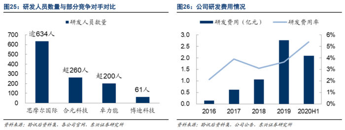 研发投入规模快速扩大。2016-2019年,公司研发费用率从2.10%提升至3.64%,共提升1.55个百分点;研发投入从0.15亿元扩大至2.77亿元,年均增长率高达166%。公司的研发费用转化为强大的技术实力与制造能力,助力公司业绩增长,使得公司有能力进一步扩大研发投入规模,不断巩固技术优势地位。