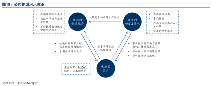 研发+制造+客户三项优势相辅相成,构成强大护城河。作为电子烟制造和陶瓷加热技术的先行者,公司目前在研发、制造、客户三个方面取得了领先优势。