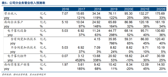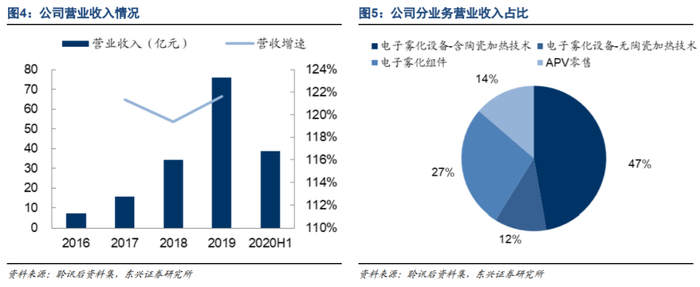 斩获龙头客户订单,营收快速扩张。公司2019年营业收入76.15亿元,同比增长122%。其中含有陶瓷加热技术的电子雾化设备收入35.95亿元,同比增长766%,是公司未来最具前景的产品之一和最主要的收入来源。得益于公司自研的先进雾化技术,以及强大的专业制造实力,公司与NJOY、英美烟草、悦刻、日本烟草等电子雾化领域龙头建立供应关系,助力客户发展并分享其高速增长的红利。公司自有品牌APV在开放式电子烟终端市场拥有一定知名度,2019年销售收入10.42亿元,同比增长11%。