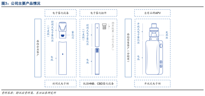 雾化设备产品矩阵丰富。公司主营业务包括:(1)封闭式电子雾化设备ODM/OEM:包括封闭式电子雾化器(含雾化芯、雾化液)和电子雾化设备(主要为电池),其中公司拥有FEELM等全球领先的核心加热技术;(2)电子雾化组件ODM/OEM:包括HNB(加热不燃烧烟草)雾化组件(雾化器、电池)及CBD(大麻二酚)雾化设备的雾化组件(雾化器、电池)等;(3)自有品牌APV零售业务:即通过分销商销售开放式电子雾化设备;根据弗若斯特沙利文的调查,公司旗下Vaporesso品牌知名度位居开放式电子烟全球第三。