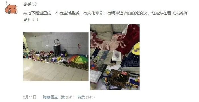 2019年2月,一位豆瓣网友发布了两张拍摄于广州某地下隧道的照片。一个流浪汉的杂物堆里,一本《人类简史》格外引人注目。