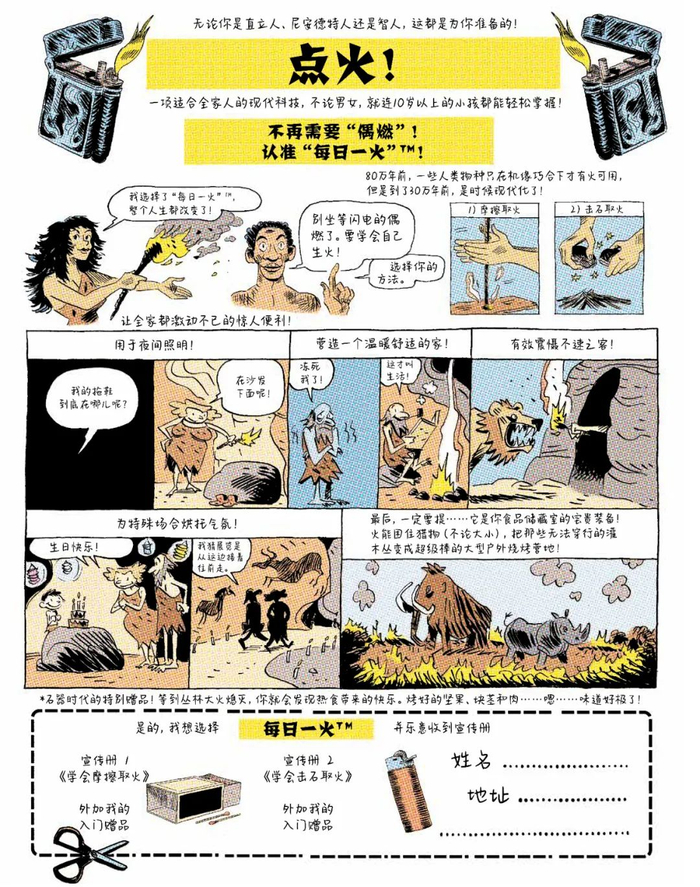 讲到人类进化过程中无比伟大的“点火”时,作者们又突发奇想,用宣传册的方式,将学会点火的好处广而告之。