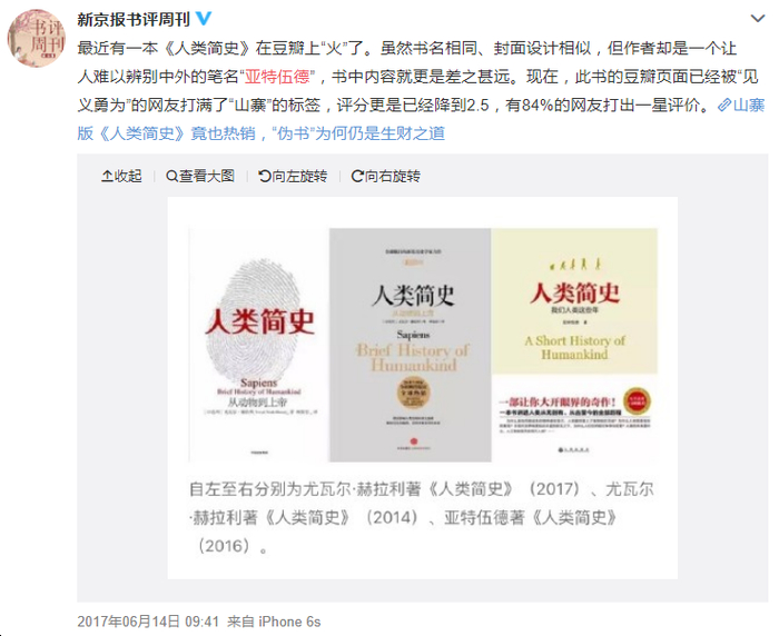 《人类简史》的火爆引发了图书市场的“简史风暴”,甚至催生恶意碰瓷的山寨书、跟风书,可见其影响之惊人。