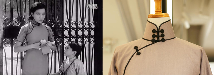 第一件传统镶花边旗袍来自电影史上经典默片《神女》,是影星阮玲玉饰演的母亲角色日常生活穿着的素淡旗袍。王腾飞介绍说:“这是上世纪30年代最具代表性的拖地长袍,其一大特点就是高领,通常有5排扣,眼前这款复制品有3排,已经能鲜明地看出特征”。 阮玲玉《神女》电影截图 (左) 传统镶花边旗袍局部 澎湃新闻记者 朱喆 图 (右)