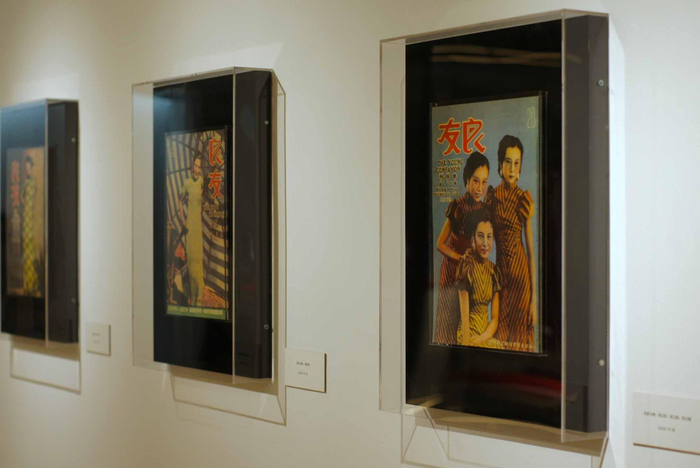 旗袍展柜前后的两幕白墙上陈列了《良友》一系列经典封面、费纳奇镜等多样展品,让观众纵览百年前魔都时尚史、上海电影发展历史。 《良友》封面图展澎湃新闻记者 朱喆 图