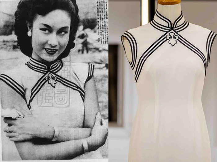 旗袍展柜另一头的两件分别是章子怡在《一代宗师》中所穿着的白色蕾丝花边连袖长旗袍,和著名影星李丽华穿着的如意双襟长旗袍。观众可以从细节中欣赏到两位金像奖影后的卓越风采。 李丽华 资料图 (左)  如意双襟长旗袍 澎湃新闻记者 朱喆 图(右)