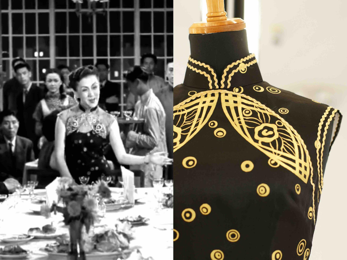第二件源自1947年由蔡楚生、郑君里执导的名片《一江春水向东流》。这件双宕金花边的手绘黑纱双襟长旗袍是为上官云珠的角色度身定制,黑色和金色的搭配贴合了何文艳作为反派人物的性情。 上官云珠 《一江春水向东流》电影截图(左) 手绘黑纱双襟长旗袍局部 澎湃新闻记者 朱喆 图(右)