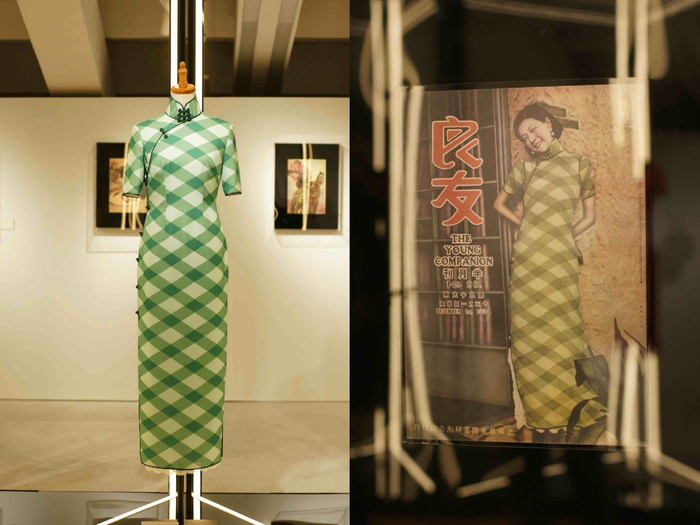 展柜“C位”的绿色格纹长旗袍是致敬上海时装历史的标志之作,阮玲玉正是穿着“它”拍下了上世纪最著名的画报《良友》第99期的封面。有意思的是,观众还可以直接在墙上找到这张封面照,两者相映成趣。 阮玲玉拍摄良友封面所穿的绿色格纹长旗袍复刻品及封面图澎湃新闻记者 朱喆 图