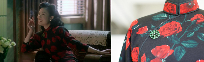 第三、第四件都有红色的元素,而且是出自香港名导的作品。大红蕾丝短旗袍是张曼玉在《花样年华》中的经典戏服,连袖印花长旗袍则是郑秀文在《长恨歌》的装扮,策展方选择她们,旨在突显沪港文化相融并生的发展历程,印证沪港两地电影亲缘。 郑秀文《长恨歌》电影截图(左) 连袖印花长旗袍局部 澎湃新闻记者 朱喆 图(右)