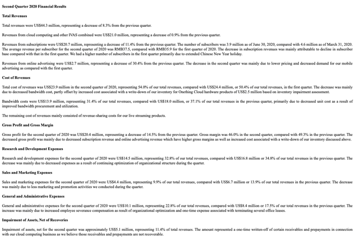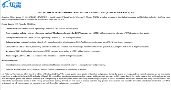 最新财报显示,2020第二季度迅雷总营收为4430万美元,环比下滑8.3%。净亏损1180万美元,而上一季度净亏损550万美元。