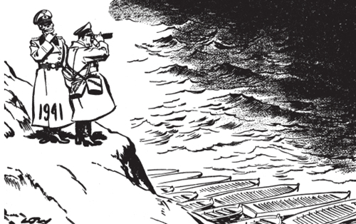 新年展望 这幅漫画发表于1940年末,此时的英国人可以自豪地回首在过去一年中取得的无与伦比的成就。在希特勒横行西欧之后,英国顶住了对伦敦的空袭,德国入侵英伦诸岛的计划毫无进展。因此,1941年把新的问题摆到了希特勒的面前。他要继续在英国拼命吗?他要入侵西班牙和北非吗?他要专注于努力创建一个行之有效的欧洲新秩序吗?或者,他要赌个最大的,豁出全力东进,攻打苏联吗?