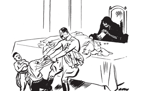 “我要把你的衬衫也赌上!” 希特勒逼迫保加利亚加入轴心国之后,开始对付南斯拉夫。这幅漫画发表于1941年2月19日。一个月后,茨韦特科维奇总理的南斯拉夫政府屈从于希特勒的要求。可是,不到24小时,杜尚·西莫维奇将军发动军事政变,在年轻的彼得国王的支持下建立了抵抗轴心国的政府。占南斯拉夫人口一半以上的塞尔维亚人支持西莫维奇。他们记得一战时奥地利人和德国人是如何对待他们的。克罗地亚人则退缩犹豫,4月6日德军进犯南斯拉夫,塞尔维亚人奋起抵抗,而克罗地亚人不是作壁上观,就是帮助德国人。