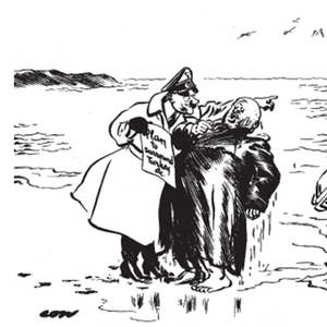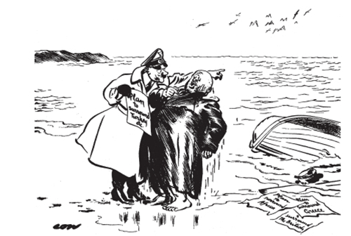 “我俩均正式否认此事正在发生” 这幅漫画发表于1941年2月13日。半个月后,保加利亚加入轴心国,德军从东面进逼南斯拉夫,从北面进逼希腊。保加利亚人也曾加入德国一方参与一战,只是这一次,他们没有了选择余地。保加利亚是个小农国家。一直以来,它大多向苏联寻求庇护,而不是德国。同时,保加利亚与它在巴尔干地区的邻国之间也有龃龉,德国利用了巴尔干地区的这个裂隙。