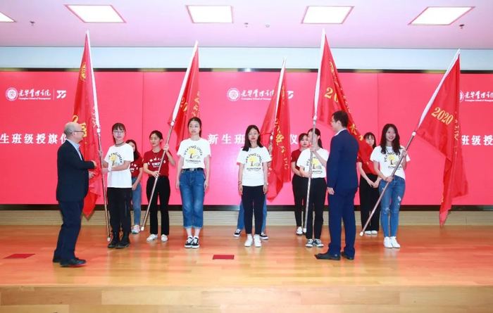 典礼上,中国学生宋雨泓代表全班同学接过了学院授予的“2020‘未来领导者’国际班”班旗,36名首批“未来领导者”在北京大学为期两年的学习生活宣告正式扬帆起航!