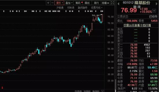 消息出台后,A股科技题材出现异动,创业板指午后一度大涨2%以上。科技题材中,以多晶硅表现最为抢眼。在涨价和光伏需求提升的双重刺激下,多晶硅题材再次大涨,板块指数今日大涨6.9%,问鼎题材涨幅榜之首。行业龙头隆基股份尾盘涨停,最新收盘价创历史新高,A股市值逼近3000亿元,年内涨幅已达到2倍以上。