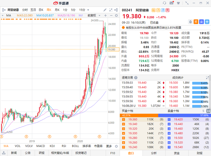 阿里健康的股价也从疫情以来一飞冲天,从2019年的6元左右,到2020年最高点24.5,最高涨幅达4倍。