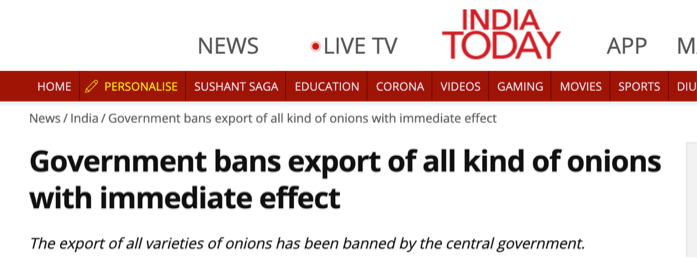 1.Government bans export of all kind of onions with immediate effect|Aishwarya Paliwal,India Today,2020.9.15
