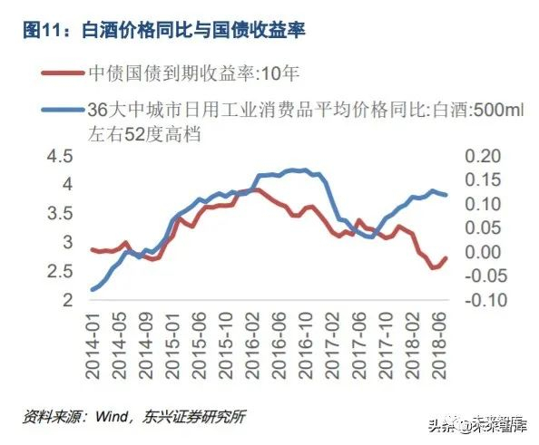 我们认为无风险收益率变化对白酒行业的影响体现在产品的价格上。白酒平均价格变化除了与自身的周期相 关,也受到 CPI 和国债收益率的影响。我们发现,国债收益率与非食品 CPI 相关性较强,同时国债收益率与 白酒价格同比存在一定的相关性。我们认为,1、厂家倾向于根据产业和经济周期、物价水平调整白酒价格;2、白酒在一定程度上受经济周期的影响,当经济上行,商务宴请需求增加,白酒价格也会上涨。目前,我 国经济逐步恢复确定性较高,PPI 和非食品 CPI 均存在回升预期,有望推动白酒价格继续上涨。
