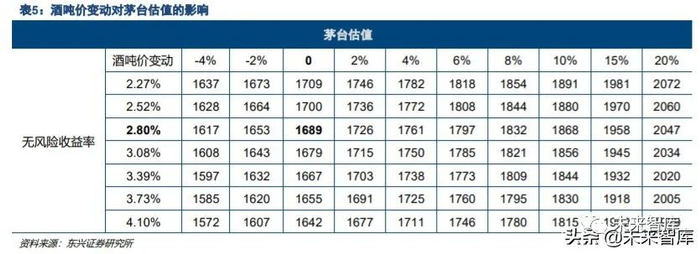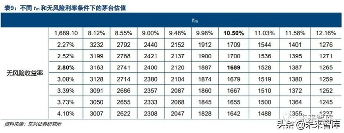 由于茅台的β接近 1,因此茅台是一个相对中性的案例。以茅台为例,当股权风险溢价(rm-rf)=7.7%时,茅 台估值为 1689 元,当(rm-rf)=7.18%时(下降 6.75%),茅台估值提升 12%。