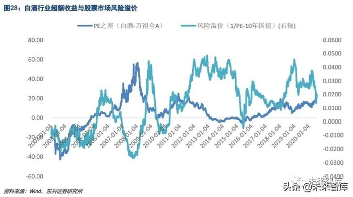 风险溢价与股票估值呈反向关系,对于高 β 的行业尤其明显。2018 年白酒板块 β 上升到 1.10,在所有行业 中处于 83%分位,2018 年间股票市场风险溢价明显上升,白酒板块相对市场的估值下滑,随后在市场风险 溢价回落时,白酒的相对估值才开始回升。(图 27)