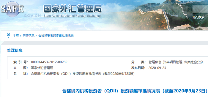 国家外汇管理局9月23日更新QDII(合格境内机构投资者)额度审批情况表显示,外汇局时隔近两年半重启QDII额度扩容。此次共向18家机构发放了QDII额度33.6亿美元,涵盖了基金、证券、理财子公司等多类型机构,截至9月23日,QDII投资总额度增加至1073.43亿美元。
