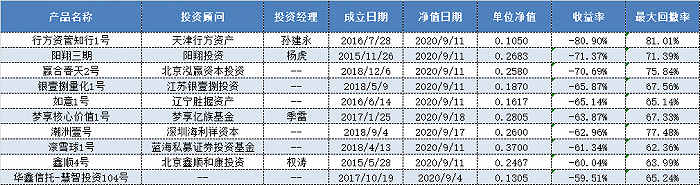 表格:今年以来收益率排名后十位的私募产品情况(数据截至9月22日更新)