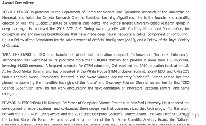 评奖委员会,也是AAAI的会员、学术界大佬,其中包括深度学习三巨头之一Bengio。
