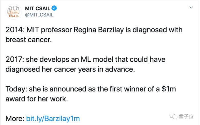 正如今天,MIT CSAIL在社交网络上表示,2014年她被诊断为乳腺癌,2017年,他建立了早期诊断风险评估模型,然后在今天,成为首届AI诺贝尔奖得主,也主要因为这项工作。