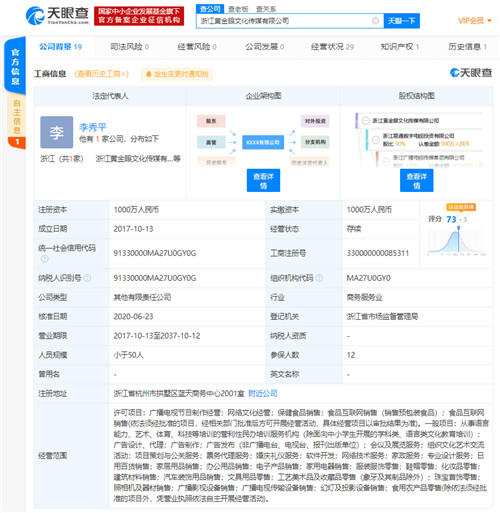 《1818黄金眼》新闻栏目由浙江广播电视集团民生休闲频道创办并运营,同样由该频道运营的还有一家浙江黄金眼文化传媒有限公司。天眼查APP显示,该公司是浙江广电的全资子公司,成立于2017年10月13日,注册资金为1000万元,由浙江广电集团授权电视民生休闲频道进行公司化经营,主要经营范围包括,为设计、制作、代理、发布国内各类广告,会展业务、网红经济、高端婚恋市场的延伸发展等。