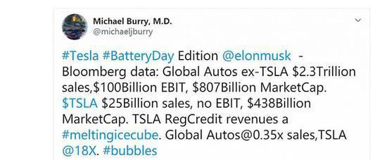 伯里写道,全球汽车(不包括特斯拉)销售额为2.3万亿美元,EBIT(息税前利润)为1000亿美元,总市值8070亿美元。而特斯拉的销售额为250亿美元,没有EBIT,市值4380亿美元。特斯拉的监管积分收入是一个正在融化的冰块。全球汽车行业市销率为0.35倍,而特斯拉是18倍。他还在这条帖子后面加上了一个#泡沫#的标签。