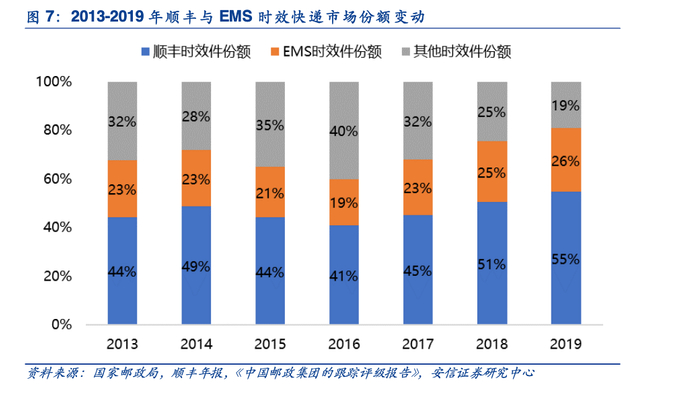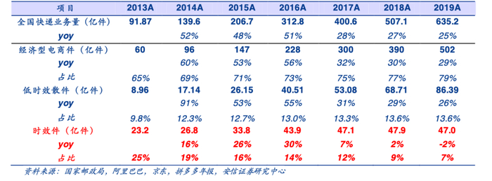 非电商件市场主要包括商务件(时效件为主)和个人散件(以低时效电商退货件为主),据安信证券测算,电商件占大盘比连年增长,2019年占比已达79%,这使得电商件市场成为炮火集中区,散件市场却鲜少获得关注。