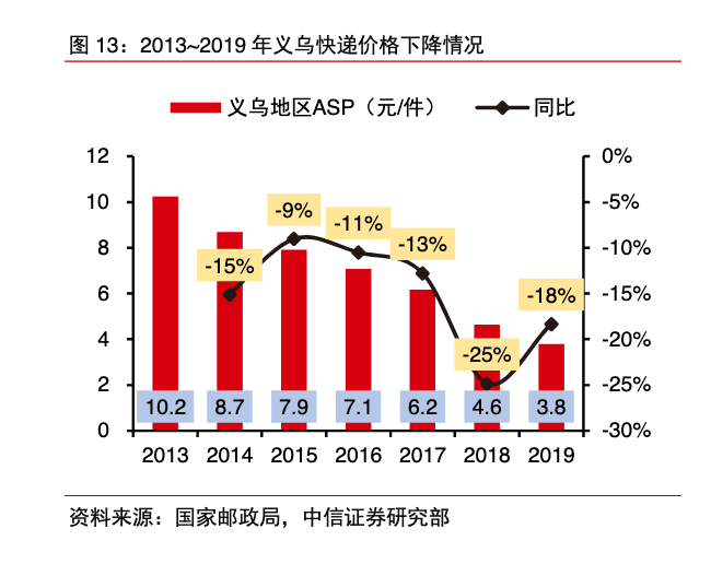 据中信证券统计,义乌快递价格连年下跌,单票价格从2013年的10.2元下降至2019年的3.8元。今年3月,义乌一些快递黄牛甚至开出“8毛发全国”的价格。据《经济观察报》报道,5月,义乌快递价格战略有缓和,有加盟商表示,网点单票均价恢复到1.5元,与去年同期相比仍有下降,但总算进入恢复区间。