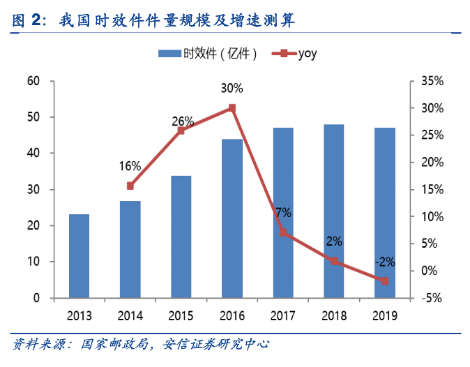 时效性快递市场由于与经济增速相关,偏向存量市场竞争,市场规模增长远不及电商件以及受电商影响的个人散件,去年甚至出现件量规模负增长情况。