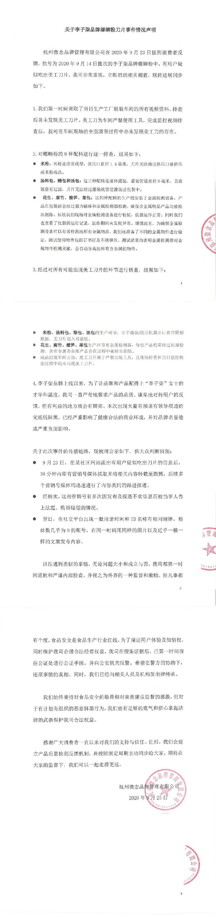 针对近日有网友发文称其朋友在李子柒旗舰店网购的螺蛳粉中吃出了刀片一事,9月25日,@李子柒品牌官方微博发布了相关情况声明。