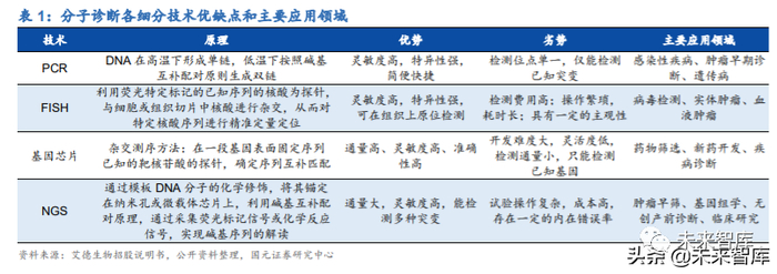 从不同技术平台看,一方面,PCR 仍将是被市场认可、应用成熟的主流分子断技术 平台,液体活检、数字 PCR、NGS 等新兴技术的快速发展将进一步丰富分子诊断的 应用领域,作为未来进入临床转暖的储备力量,潜力十足;另一方面,鉴于分子诊断 复杂的应用场景、各类患者多样化的临床需求,新技术的出现不是为了完全取代传统 技术,而是更好的补充和完善现有技术平台,比如 PCR 技术经过几十年的发展也没 有完全淘汰 FISH 技术,后者仍是检测 HER-2 基因状态的“金标准”;根据应用场景 和检测需求的不同,NGS 和 PCR 上各有优势,PCR 适合基因位点已知、对灵敏度要求较高以及组织样本的检测,NGS 在发现未知基因、血液 ctDNA 检测上则更具 优势,二者是优势互补、长期共存的关系。