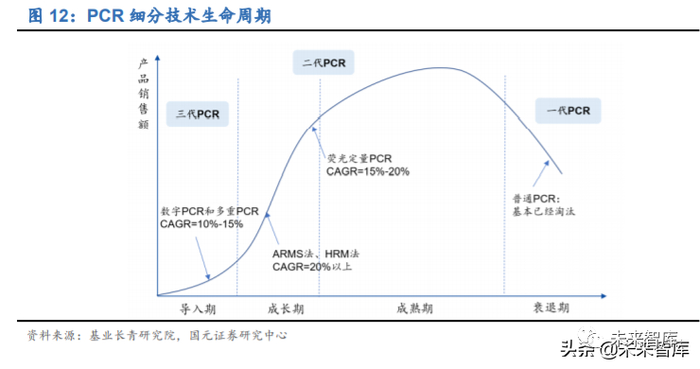 第二代荧光定量 PCR(qPCR)技术:qPCR 在一代定量 PCR 的基础上引入荧光探针标记法从而实现定量检测,目前发展最成熟、应用最广泛、临床普及率高, 为现阶段主流应用平台,正处于从成长期向成熟期过渡的阶段,市场增速在 20% 以上;