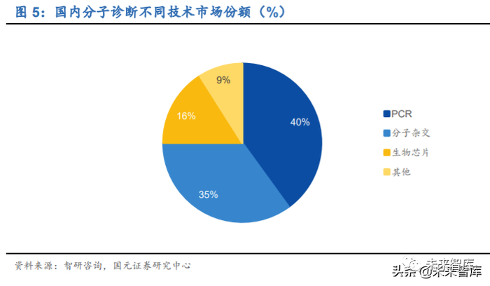 分子诊断领域主要包括 PCR(qPCR 和 dPCR)、二代测序技术(NGS)、荧光原位 杂交(FISH)、基因芯片等,其中 PCR 是目前应用最成熟、市场份额最大的技术平 台,在国内分子诊断中市占率为 40%,在国内获批的分子诊断产品中,基于 PCR 技 术的超过 90%。与杂交技术和测序技术相比,PCR 技术主要优势在于高灵敏度、易 于推广,主要局限在于检测位点单一且已知,多重基因联合检测时可涵盖的基因数量 受限,目前已经发展到第三代数字 PCR(dPCR),短期内仍将是分子诊断主流技术 平台;测序技术发展迅猛,虽然市占率较低但市场增速最快,其中二代测序技术 NGS (高通量测序)是目前测序领域应用最广泛的技术,已经成为许多序列变异分析与科 研应用的主要选择,但由于实验操作复杂、成本高等原因,在临床应用中仍处于起步 阶段,应用前景广阔。