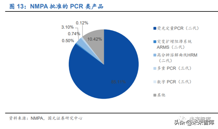 第三代数字 PCR(dPCR)技术:dPCR 是在 PCR 原理的基础上利用芯片和荧 光检测技术进行核酸绝对定量检测。芯片技术是 dPCR 的核心工艺,利用对样 品进行分液处理进而实现“单分子模板 PCR 扩增”,达到定量检测的目的,具 有更高的精确度和灵敏度,目前处于导入期,市场增速在 10%-15%。