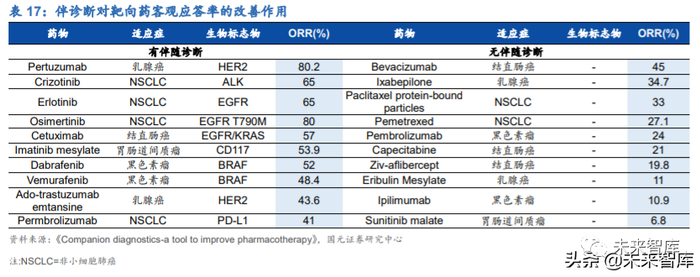 伴随诊断能够解决药物研发风险高、治疗应答率低的问题。根 Jorgensen&Hersom 在 2016 年的研究数据显示,过去 15 年内批准的靶向药物中,无伴随诊断的靶向药 物客观应答率仅为 7%-45%,有伴随诊断的药物客观应答率(ORR)在 41%-80%之 间,伴随诊断提升靶向用药客观应答率的效果显著。