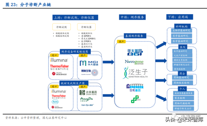 上游诊断试剂和仪器供应商:国内分子诊断试剂发展较为迅速,基本已经实现国 产化;诊断仪器领域,国产仪器占比较小,其中核酸提取仪、普通 PCR 仪、基 因芯片仪、分子杂交仪等技术相对容易攻破的中端仪器领域基本已经实现国产 替代化,而包括数字 PCR仪和基因测序仪在内的高端仪器主要由外资品牌主导, 技术壁垒极高,国产品牌正处于起步阶段。数字 PCR 仪目前市场上基本被 BioRad、Thermo Fisher、Stilla Technomogies 国际大品牌所占有。基因测序仪领 域基本被 Illumina、Thermo Fisher、Rocher 等外资品牌垄断,目前国内仅有华 大基因等个别优秀国产品牌实现了自主研发生产的基因测序仪,大多数企业是 通过 OEM(贴牌)和合作研发的形式完善产业链布局。