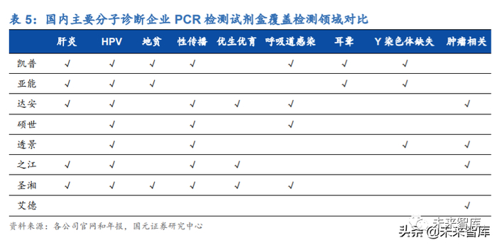 国内 PCR 行业竞争激烈,不同细分领域龙头效应显著。二代 PCR 技术门槛相对较 低,国内获批的 PCR 检测产品数量多、竞争激烈,主要企业包括达安基因、艾德生 物、凯普生物、之江生物、硕世生物、透景生物、圣湘生物等。从获批的 PCR 检测试剂盒数量维度看,达安基因拥有 38 种基于 qPCR 技术的检测试剂盒取得 NMPA 的批文;从不同细分应用领域维度看,各家产品线重合度较高,尤其是优生优育、性 传播疾病、HPV 检测等领域竞争激烈,但艾德生物、凯普生物、亚能生物凭借多年 在不同细分领域的先发优势、技术积累以及渠道优势等分别在伴随诊断、HPV 检测、 地中海贫血检测领域处于绝对领先地位,其中凯普生物在 HPV 检测领域占据 1/3 市 场份额,艾德生物在 PCR 伴随诊断领域具有绝对领先优势。